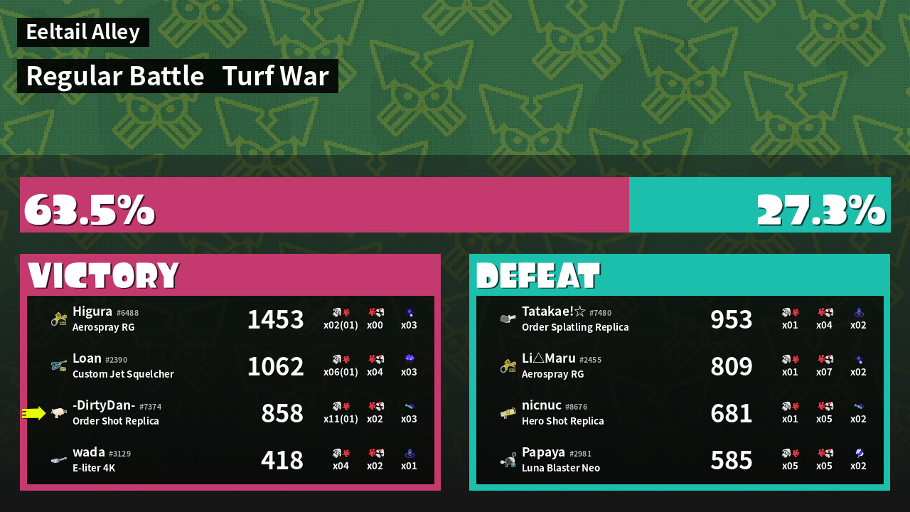 | Medals | #1 Overall Splatter #1 Enemy-Base Inker #1 Enemy Splatter | ||
