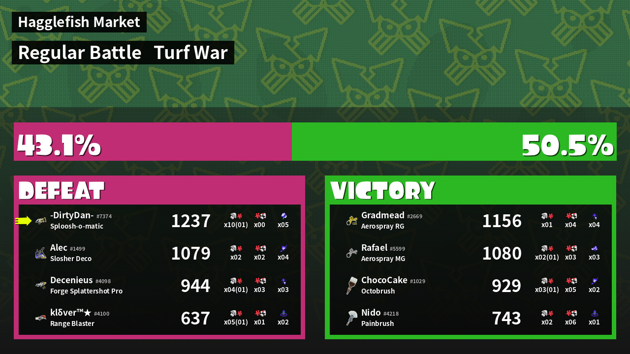 | Medals | #1 Overall Splatter #1 Turf Inker #1 Enemy Splatter | ||
