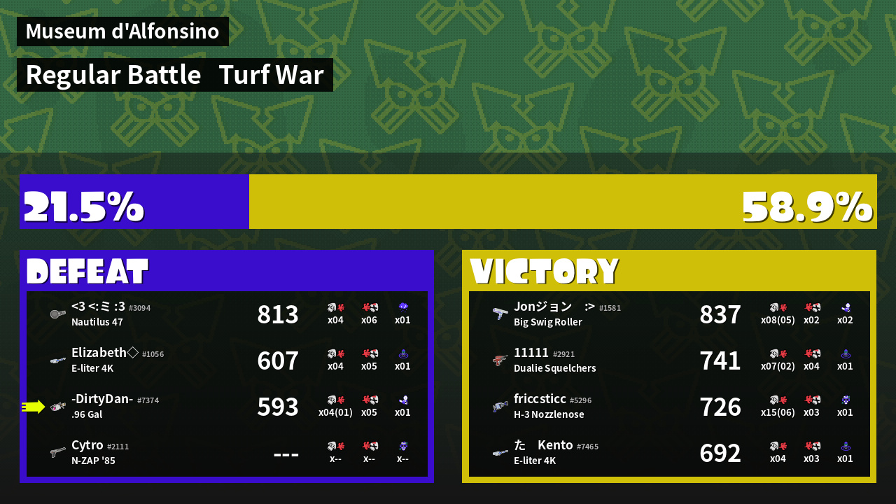 | Medals | #1 Overall Splatter #1 Enemy-Base Inker #1 Splat Assister | ||