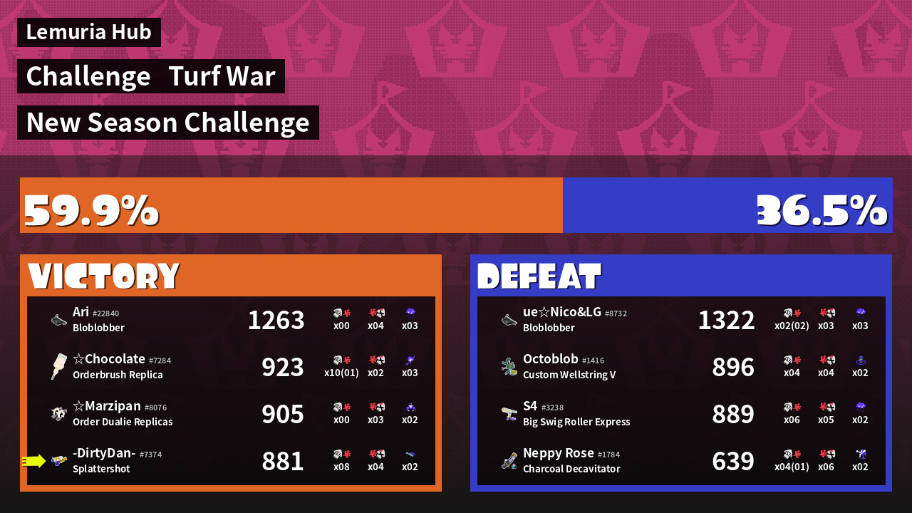 | Medals | #1 Super Jump Spot #1 Trizooka User #2 Overall Splatter | ||
