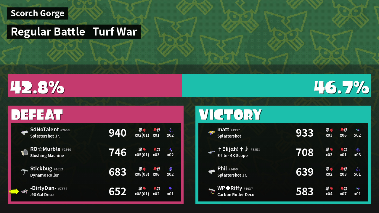 | Medals | #1 Overall Splatter #1 Enemy Splatter #2 Home-Base Inker | ||