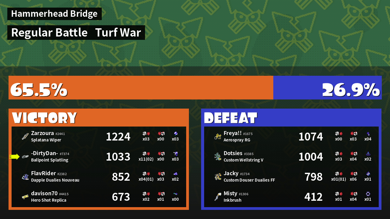 | Medals | #1 Overall Splatter #1 Popular Target #1 Enemy-Base Inker | ||