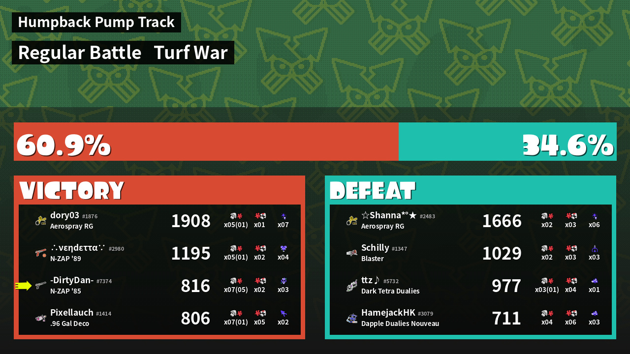 | Medals | #1 Overall Splatter #1 Splat Assister #1 Base Defender | ||