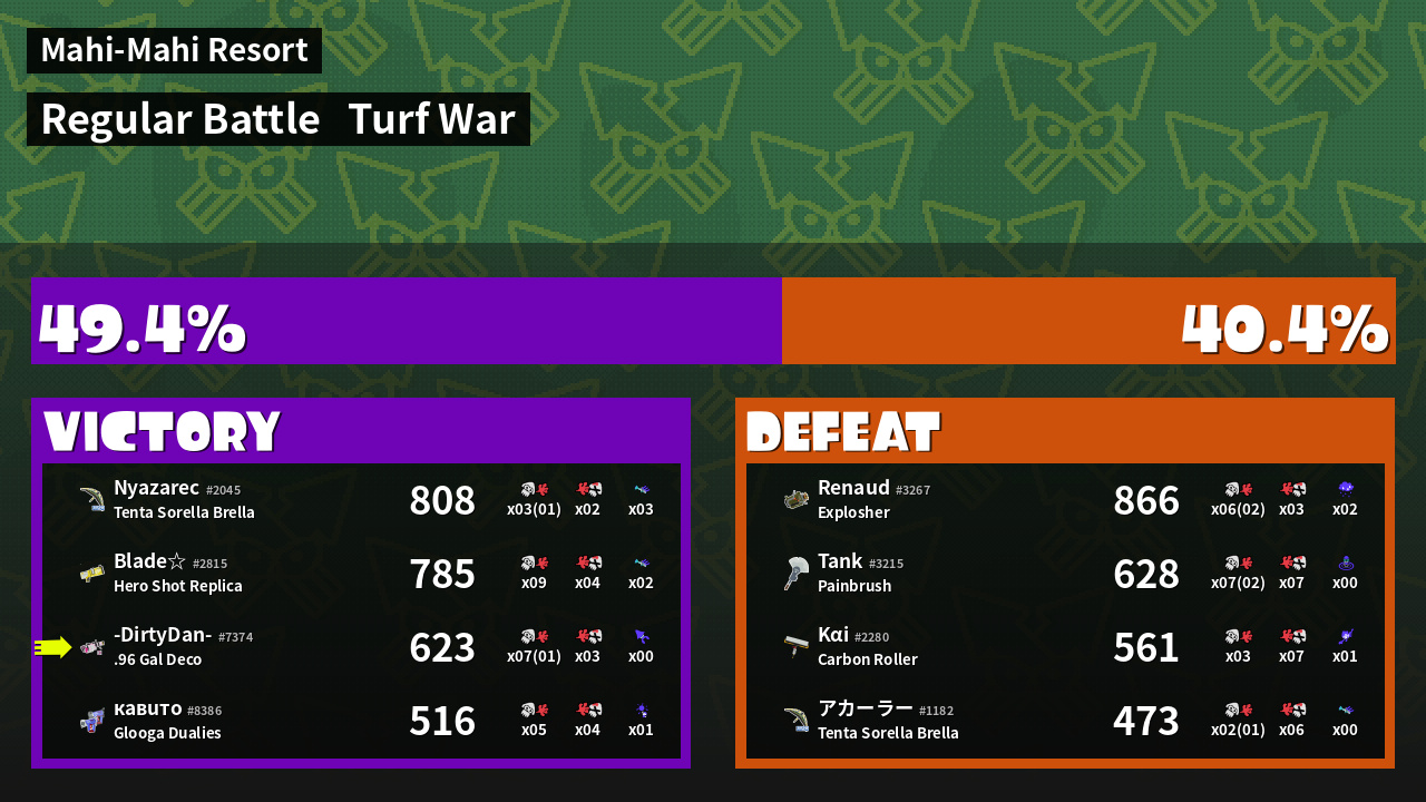 | Medals | #1 Splat Assister #2 Overall Splatter #2 Home-Base Inker | ||