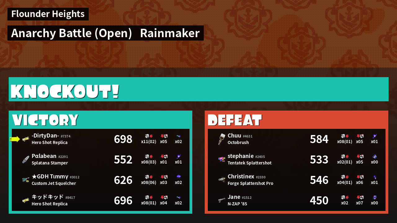 | Medals | #1 Overall Splatter #1 Turf Inker #1 Enemy Splatter | ||