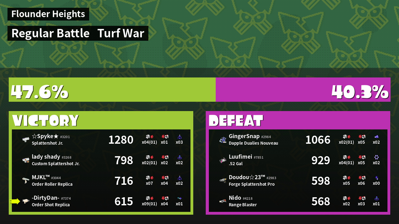 | Medals | #1 Overall Splatter #1 Enemy Splatter #1 Splat Assister | ||