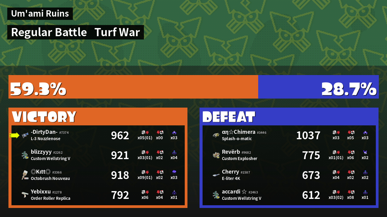 | Medals | #1 Turf Inker #1 Splat Assister #1 Ink Consumer | ||
