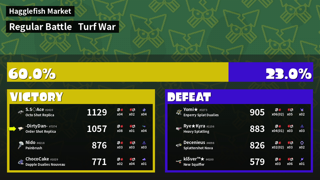 | Medals | #1 Overall Splatter #1 Popular Target #1 Enemy-Base Inker | ||