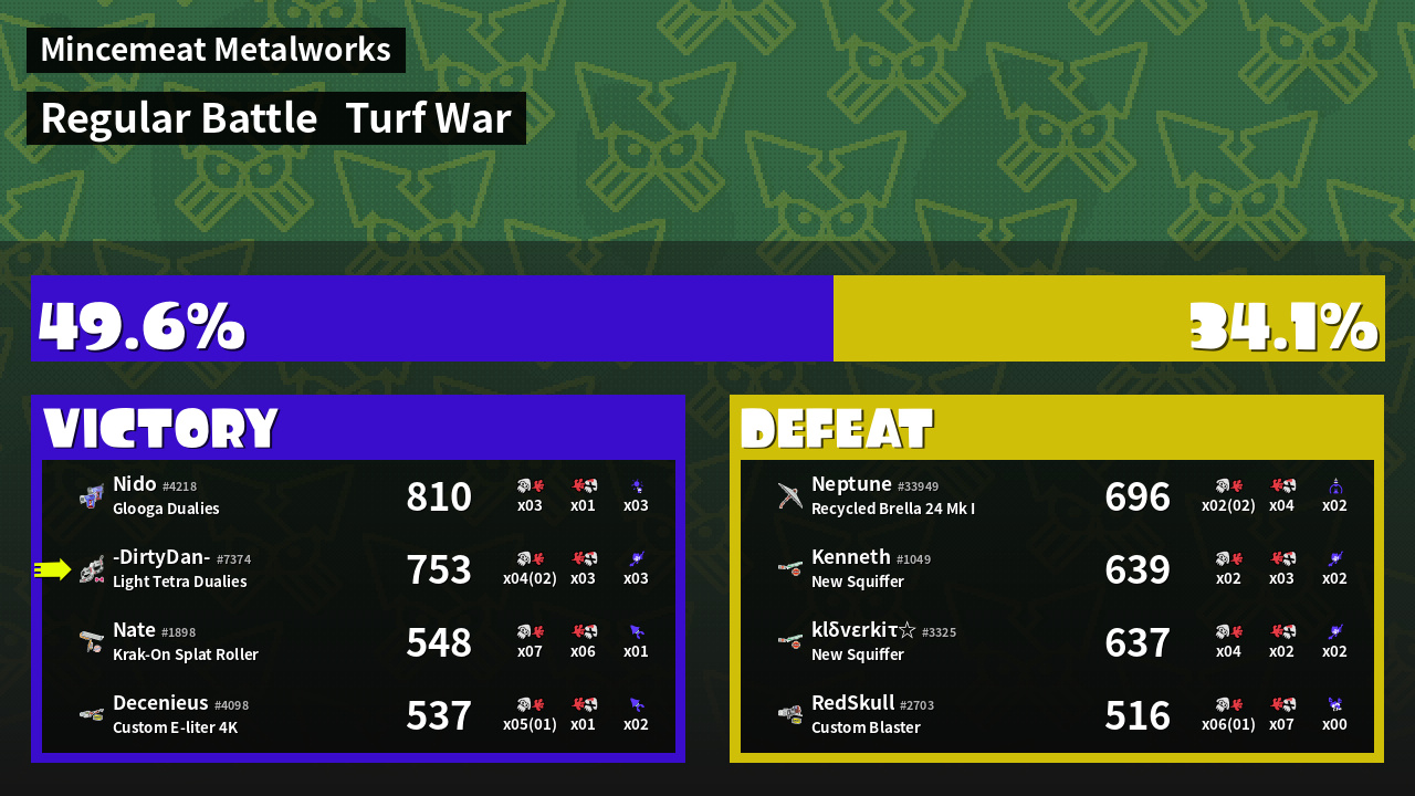 | Medals | #1 Enemy-Base Inker #1 Splat Assister #2 Turf Inker | ||