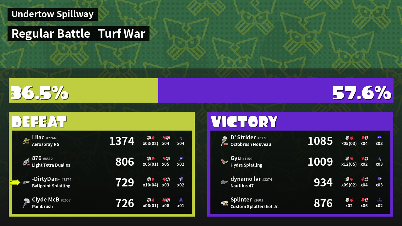| Medals | #1 Overall Splatter #1 Enemy Splatter #1 Splat Assister | ||