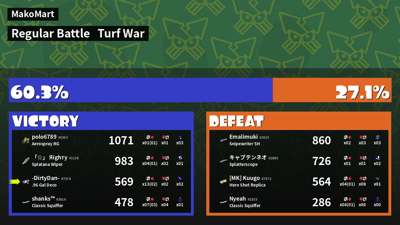 | Medals | #1 Overall Splatter #1 Popular Target #1 Enemy-Base Inker | ||