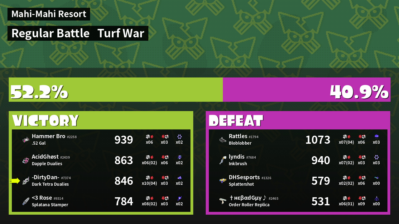 | Medals | #1 Overall Splatter #1 Enemy-Base Inker #1 Enemy Splatter | ||