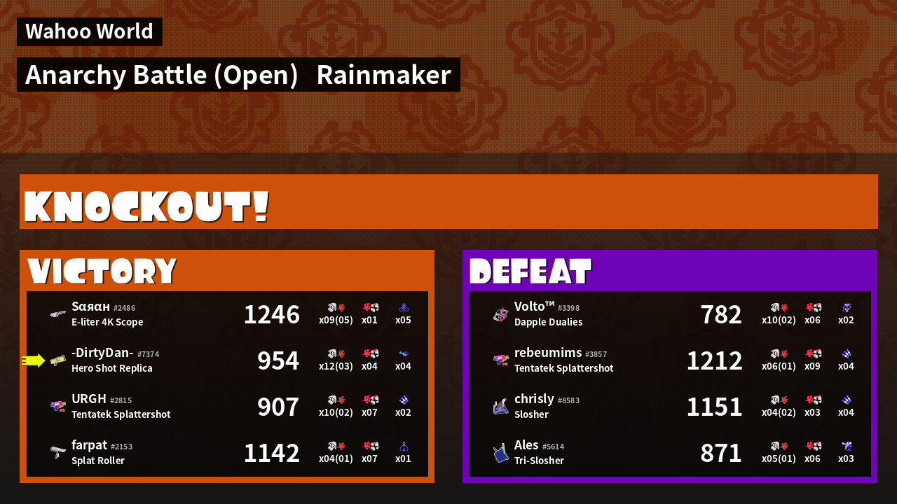 | Medals | #1 Overall Splatter #1 Enemy Splatter #1 Rainmaker Stopper | ||