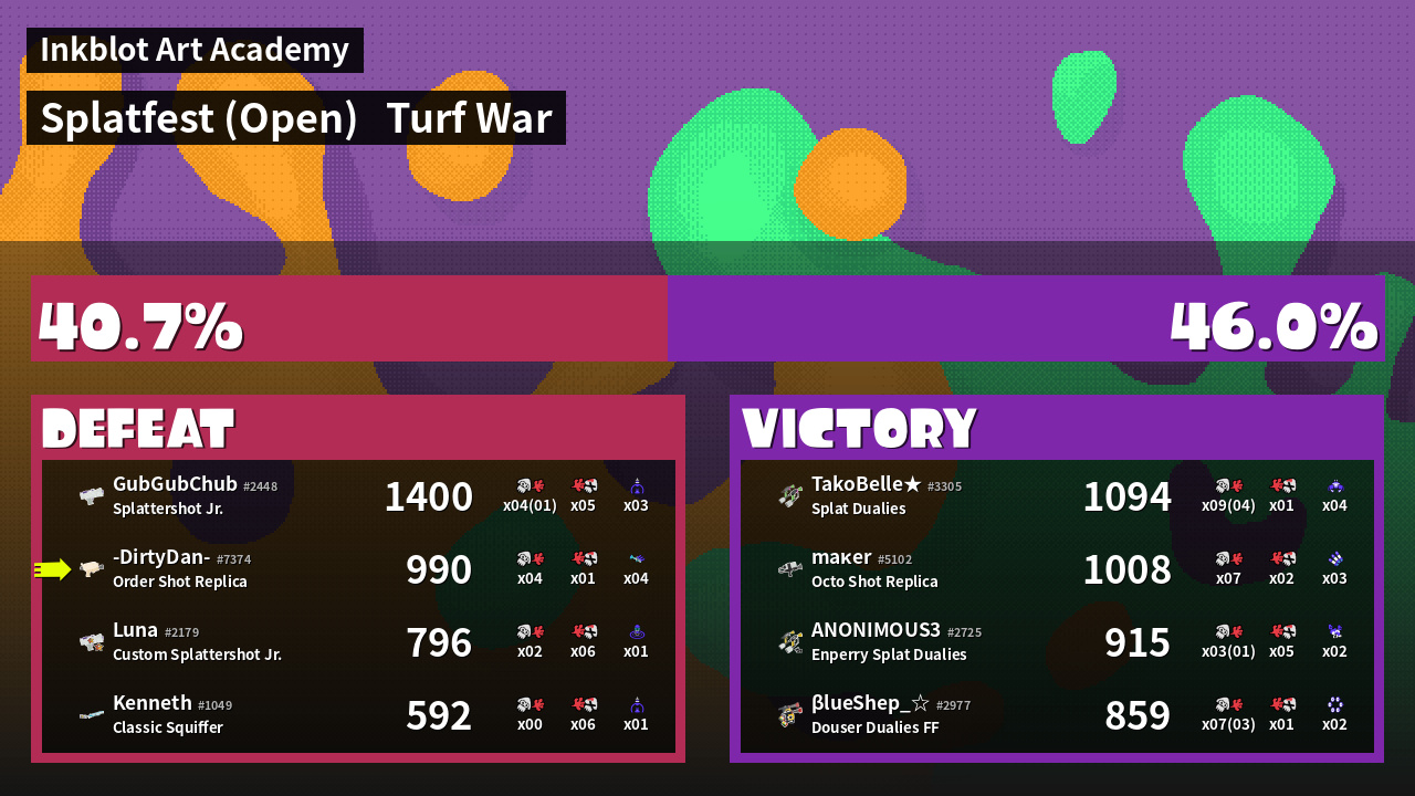 | Medals | #1 Overall Splatter #1 Enemy Splatter #1 Ink Consumer | ||
