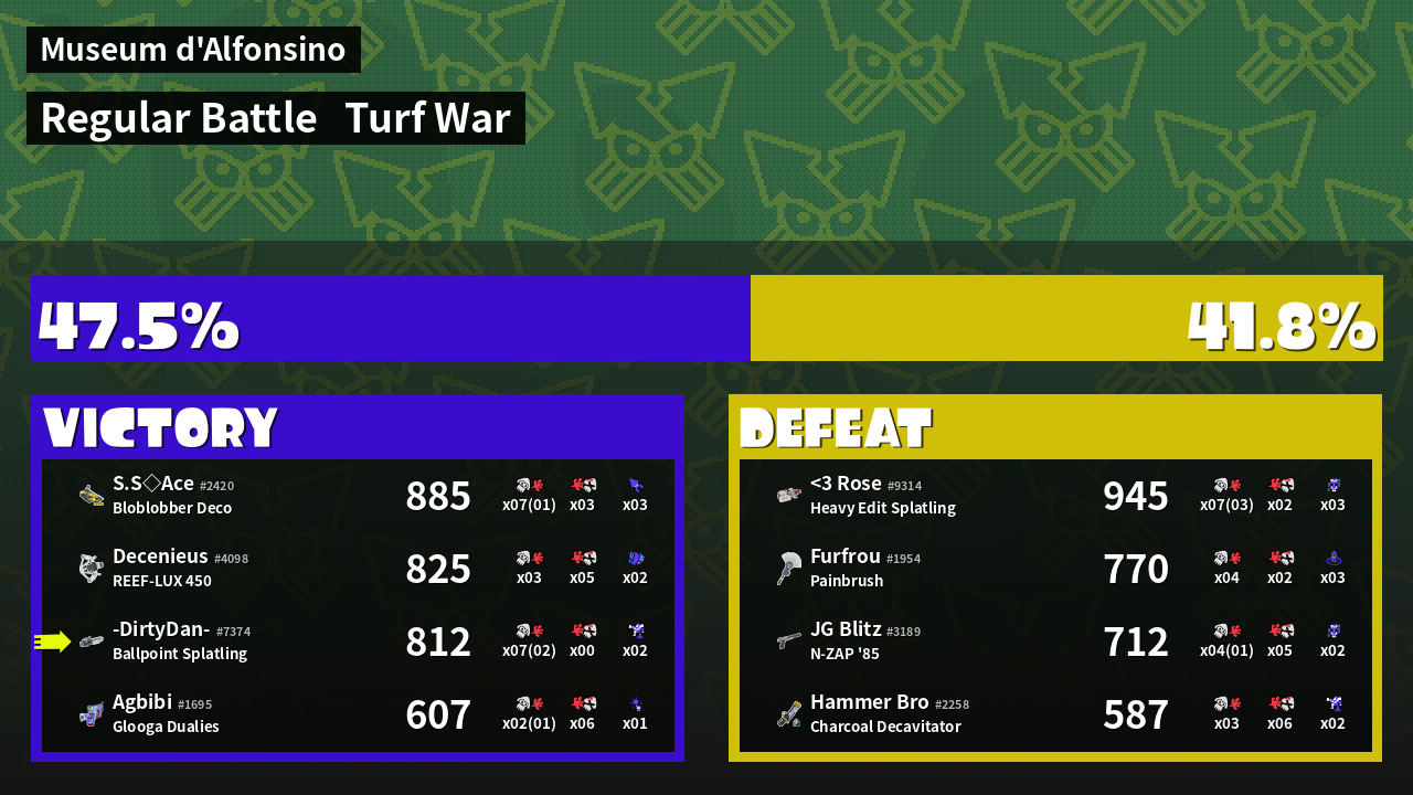 | Medals | #1 Overall Splatter #1 Enemy-Base Inker #1 Splat Assister | ||