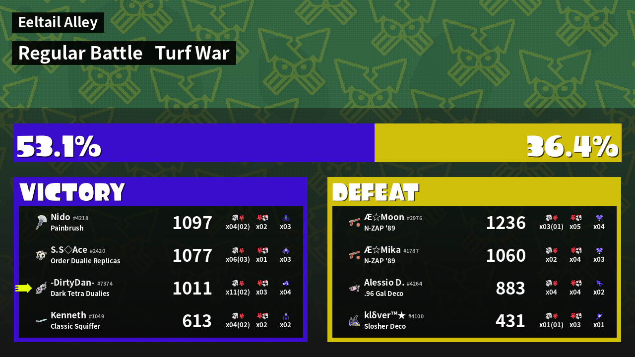 | Medals | #1 Overall Splatter #1 Popular Target #1 Enemy-Base Inker | ||