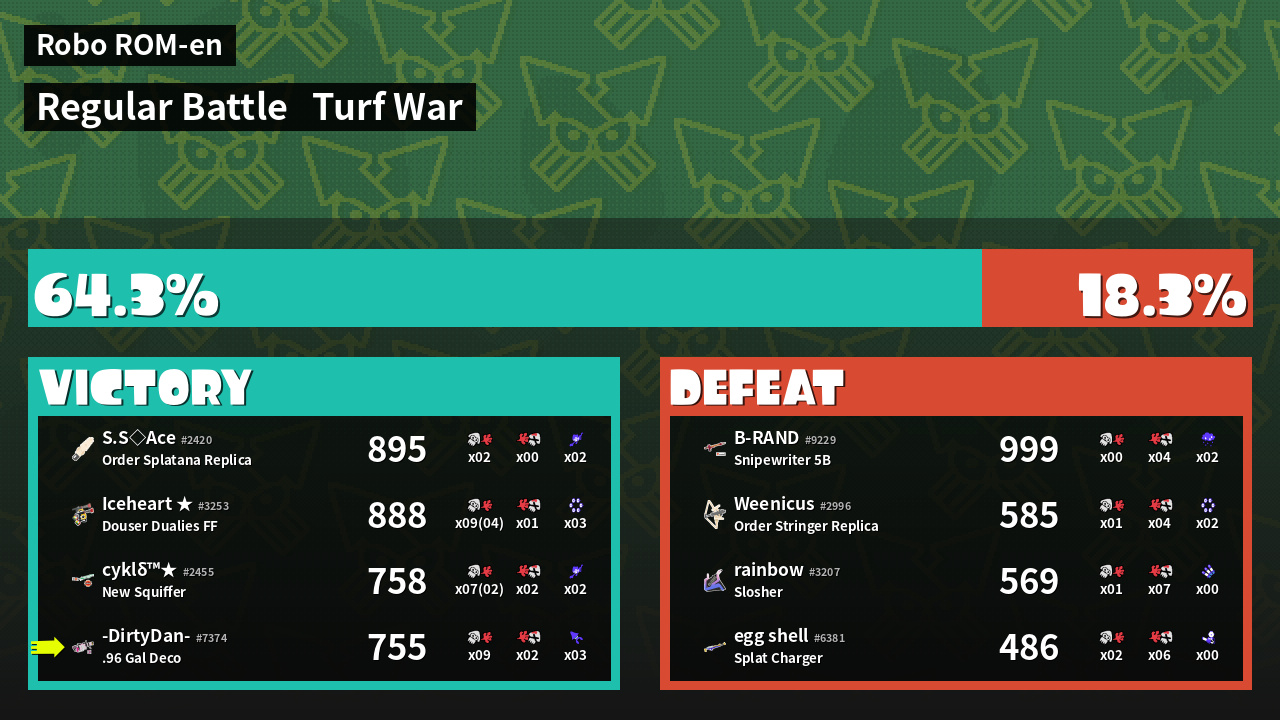 | Medals | #1 Overall Splatter #1 Popular Target #1 Enemy-Base Inker | ||