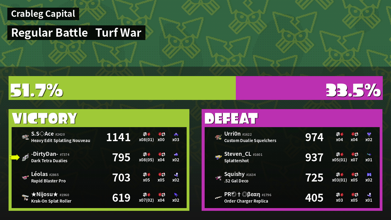 | Medals | #1 Overall Splatter #1 Enemy-Base Inker #1 Splat Assister | ||