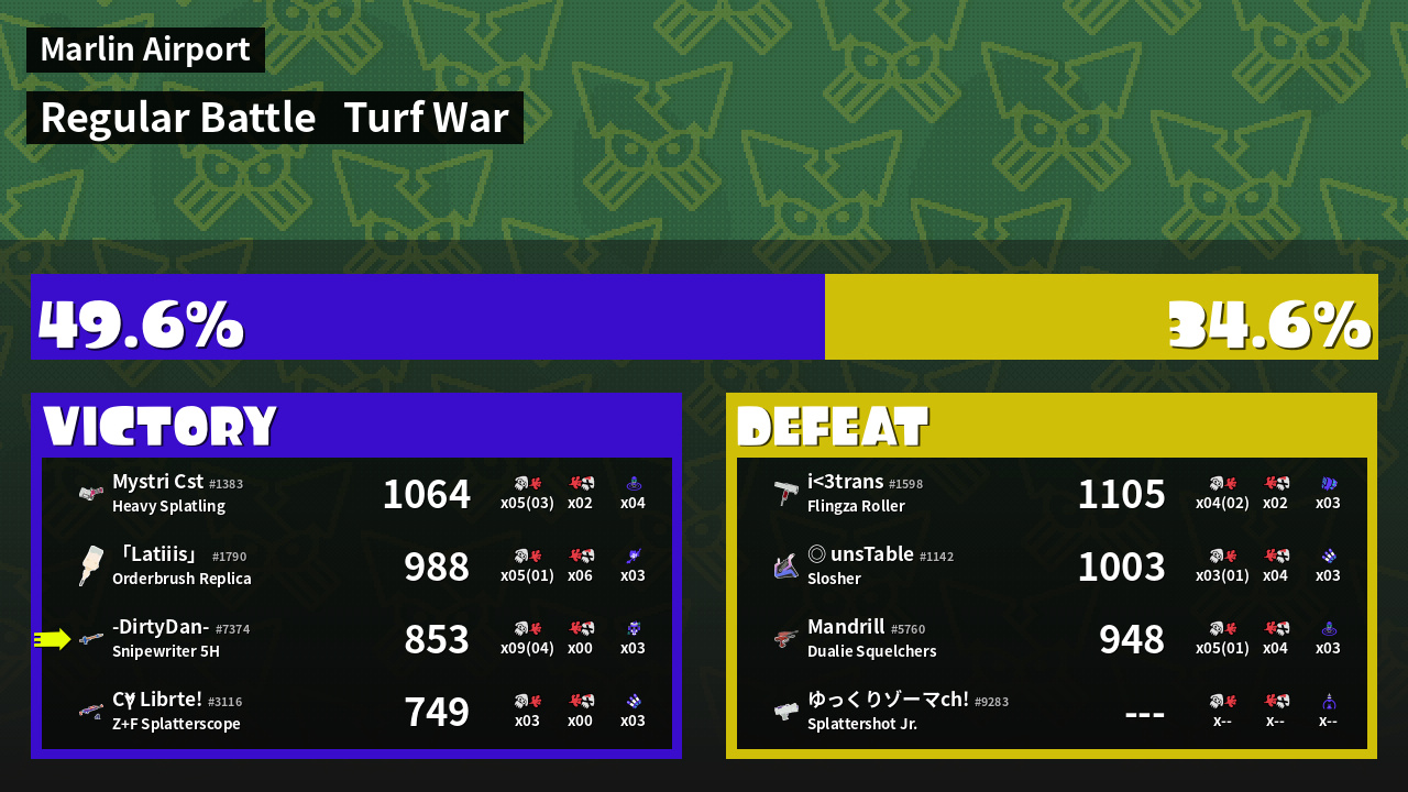 | Medals | #1 Overall Splatter #1 Enemy Splatter #1 Splat Assister | ||