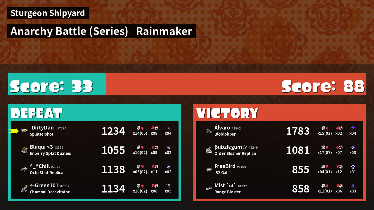 | Medals | #1 Overall Splatter #1 Turf Inker #1 Enemy Splatter | ||