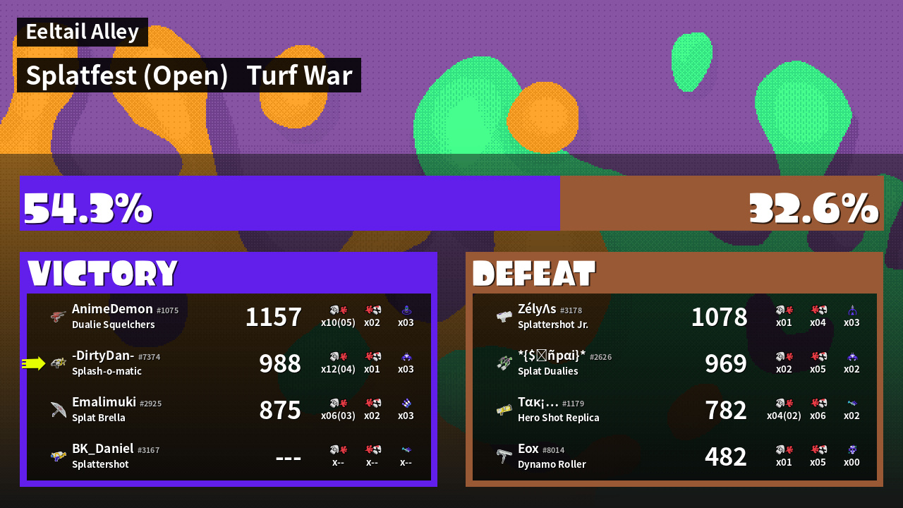 | Medals | #1 Overall Splatter #1 Popular Target #1 Enemy-Base Inker | ||