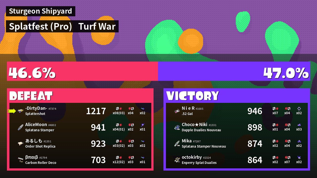 | Mode | Turf War - Splatfest (Pro) | ||
