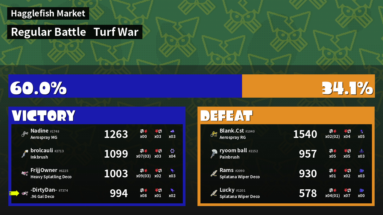 | Medals | #1 Enemy Splatter #1 Damage Taker #1 Kraken Royale User | ||