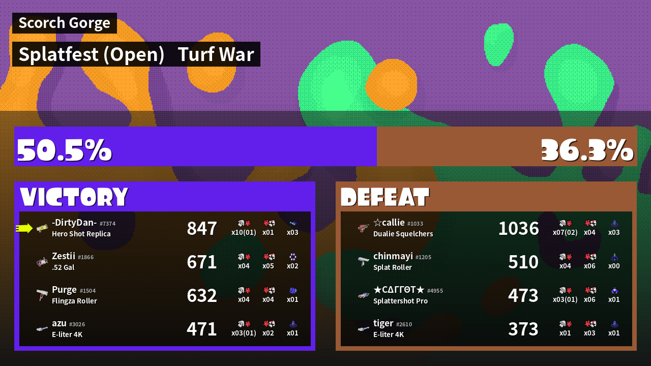 | Medals | #1 Overall Splatter #1 Turf Inker #1 Enemy-Base Inker | ||