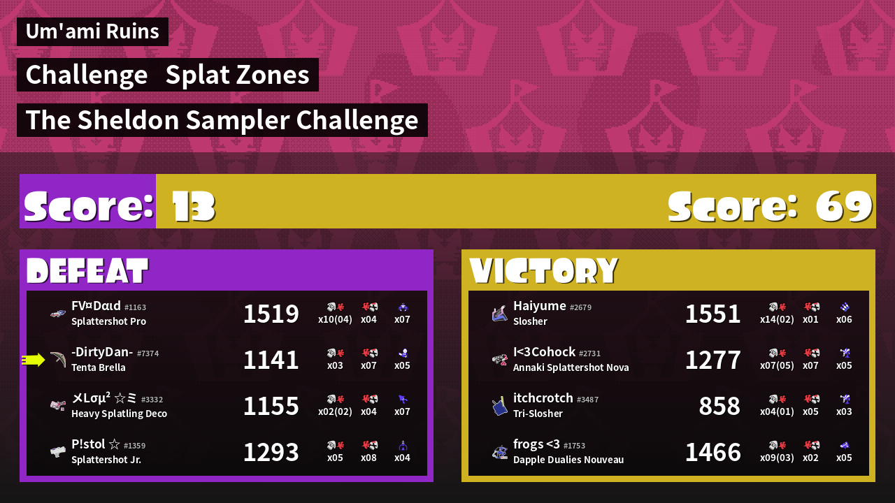 | Challenge | The Sheldon Sampler Challenge Make the most of random weapons! | ||