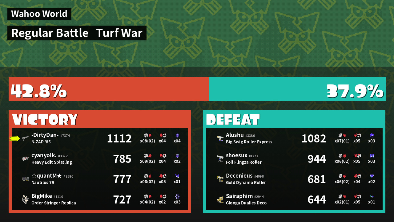 | Medals | #1 Turf Inker #1 Splat Assister #1 Ground Traveler | ||