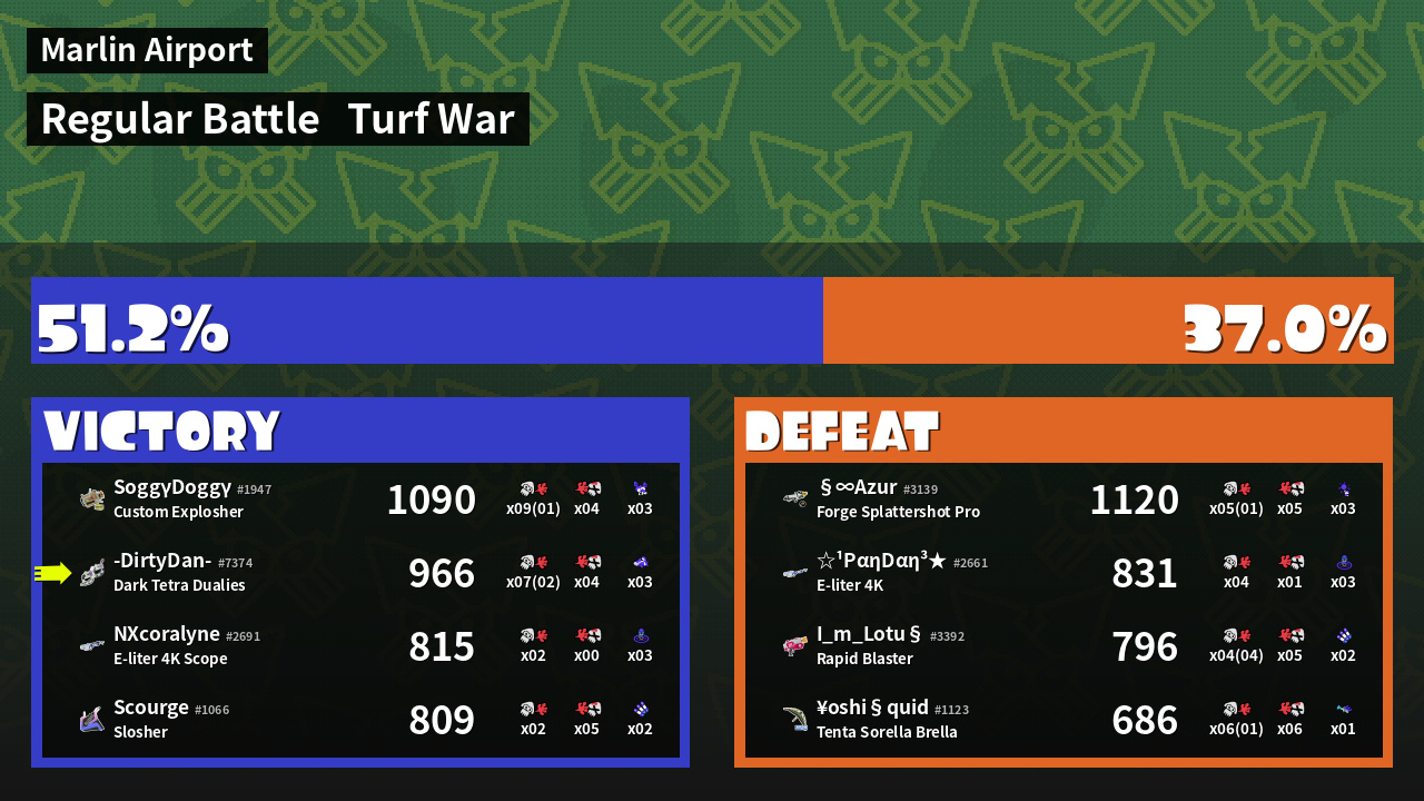 | Medals | #1 Enemy-Base Inker #1 Splat Assister #1 Base Defender | ||