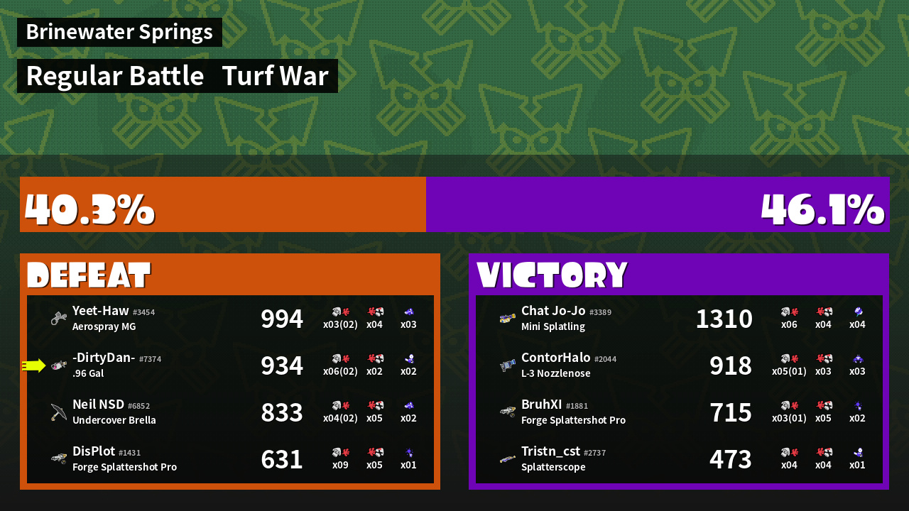 | Medals | #1 Splat Assister #1 Ink Consumer #2 Overall Splatter | ||