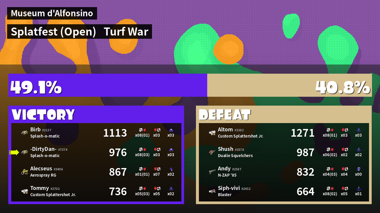 | Medals | #1 Overall Splatter #1 Enemy-Base Inker #1 Splat Assister | ||