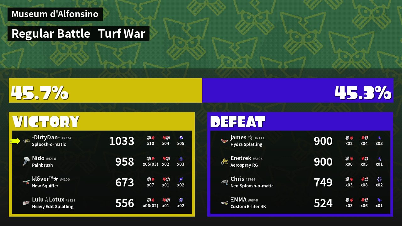 | Medals | #1 Overall Splatter #1 Turf Inker #1 Enemy-Base Inker | ||