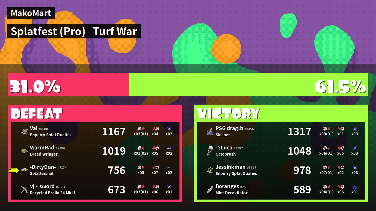 | Medals | #1 Overall Splatter #1 Enemy-Base Inker #1 Enemy Splatter | ||