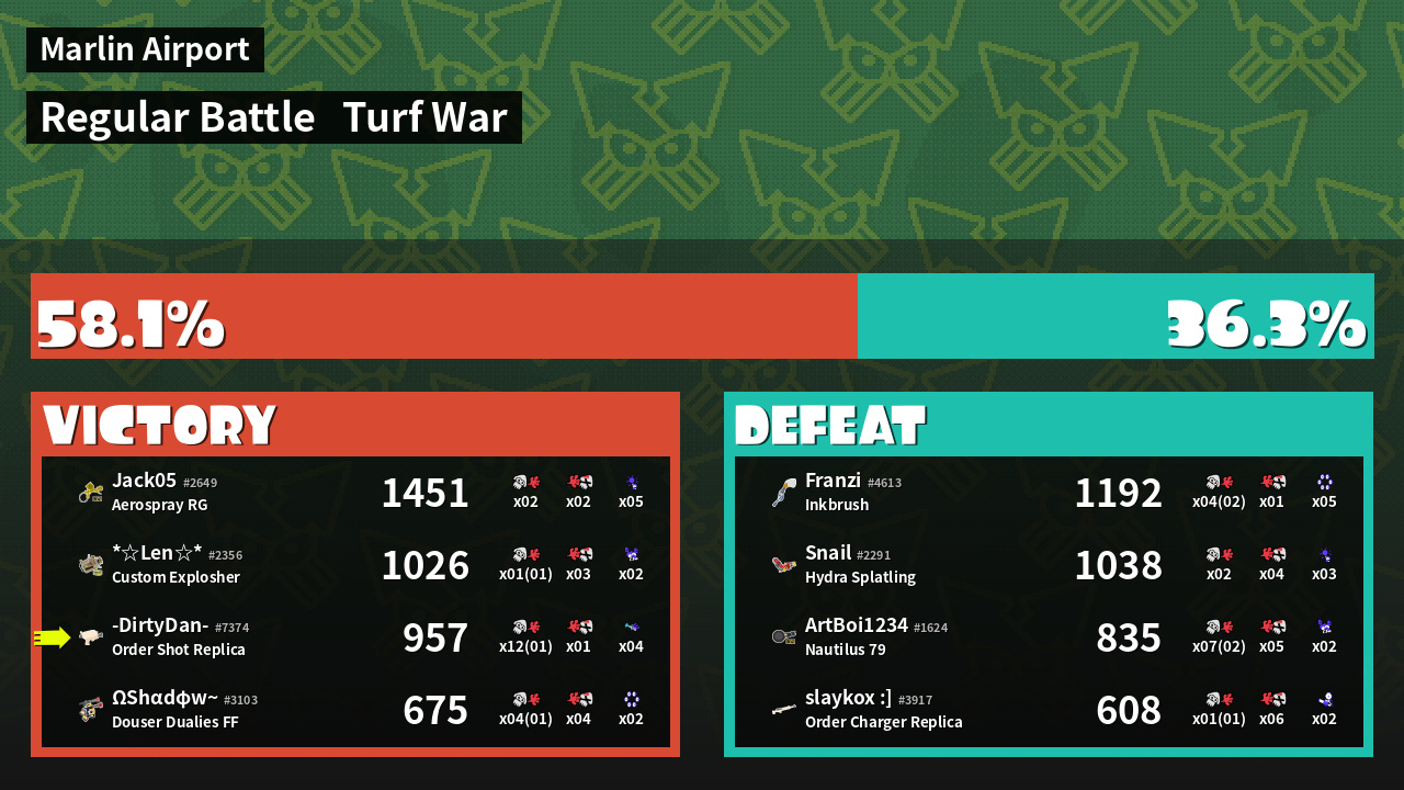| Medals | #1 Overall Splatter #1 Popular Target #1 Enemy-Base Inker | ||
