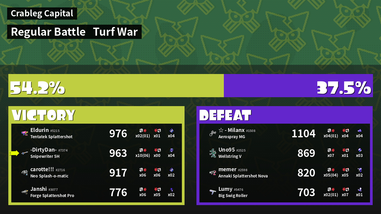 | Medals | #1 Overall Splatter #1 Splat Assister #1 Base Defender | ||