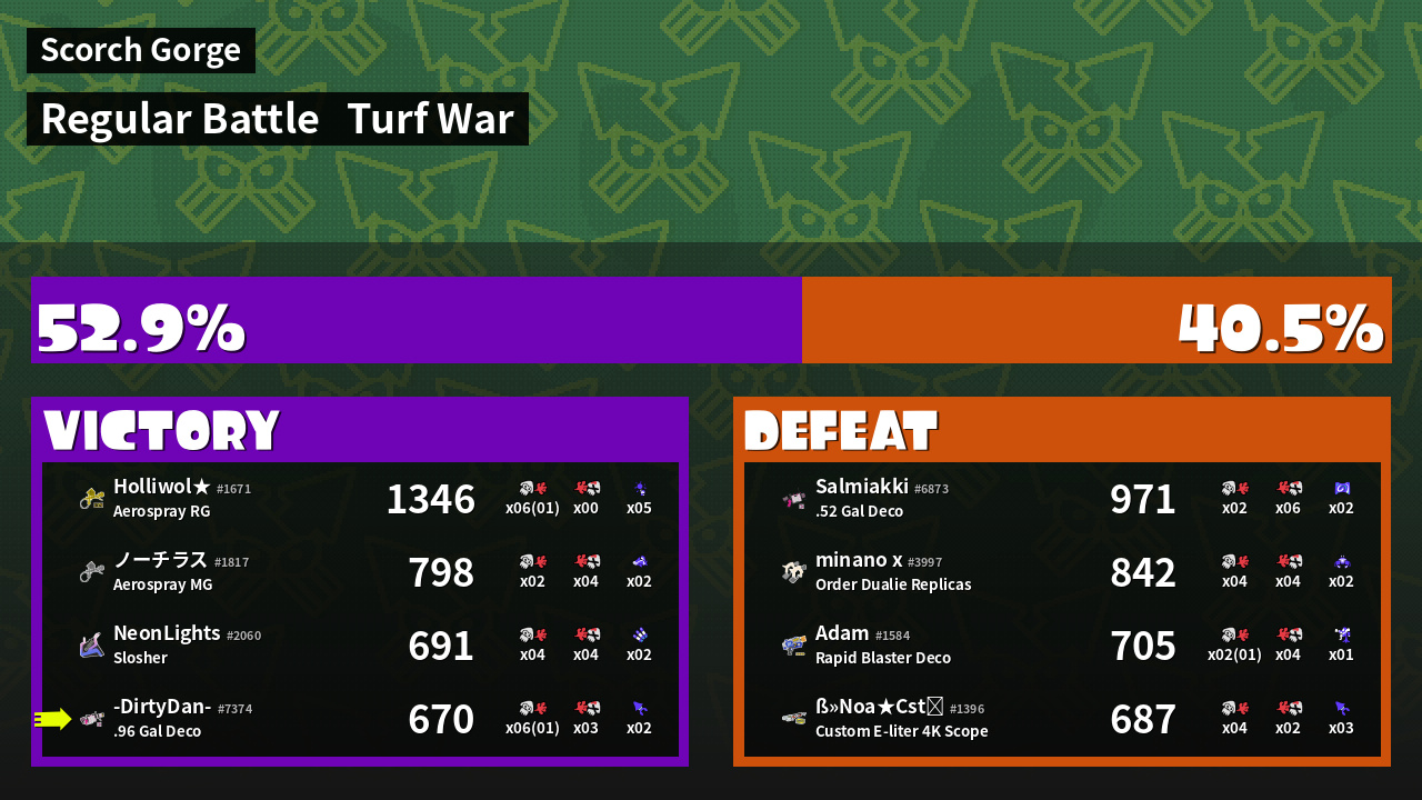 | Medals | #1 Overall Splatter #1 Enemy Splatter #1 Splat Assister | ||