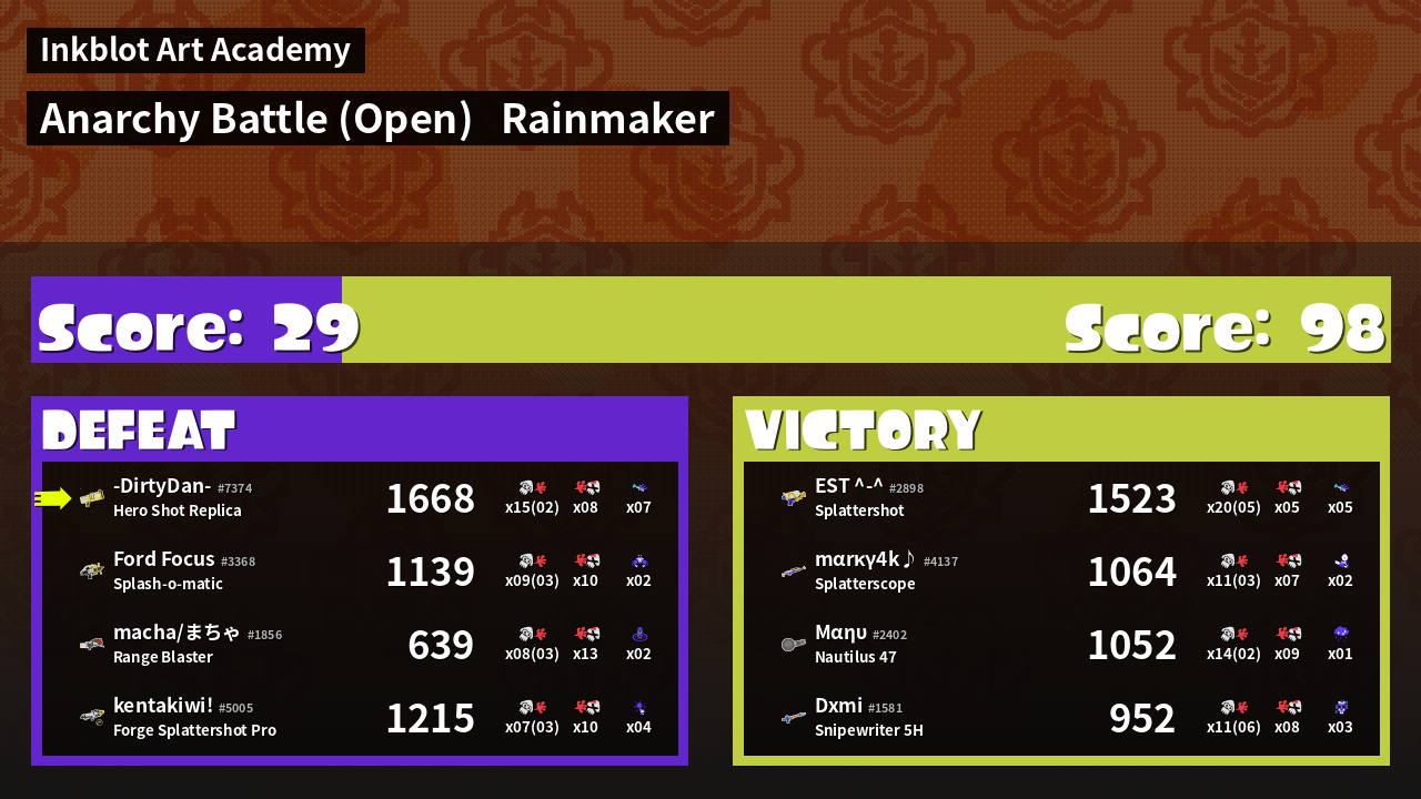 | Medals | #1 Overall Splatter #1 Turf Inker #1 Enemy Splatter | ||