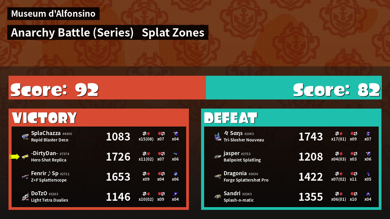 | Medals | #1 Splat Zone Inker #1 Turf Inker #1 Enemy Splatter | ||