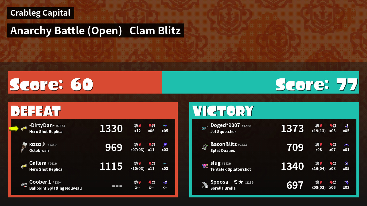 | Mode | Clam Blitz - Anarchy Battle (Open) | ||