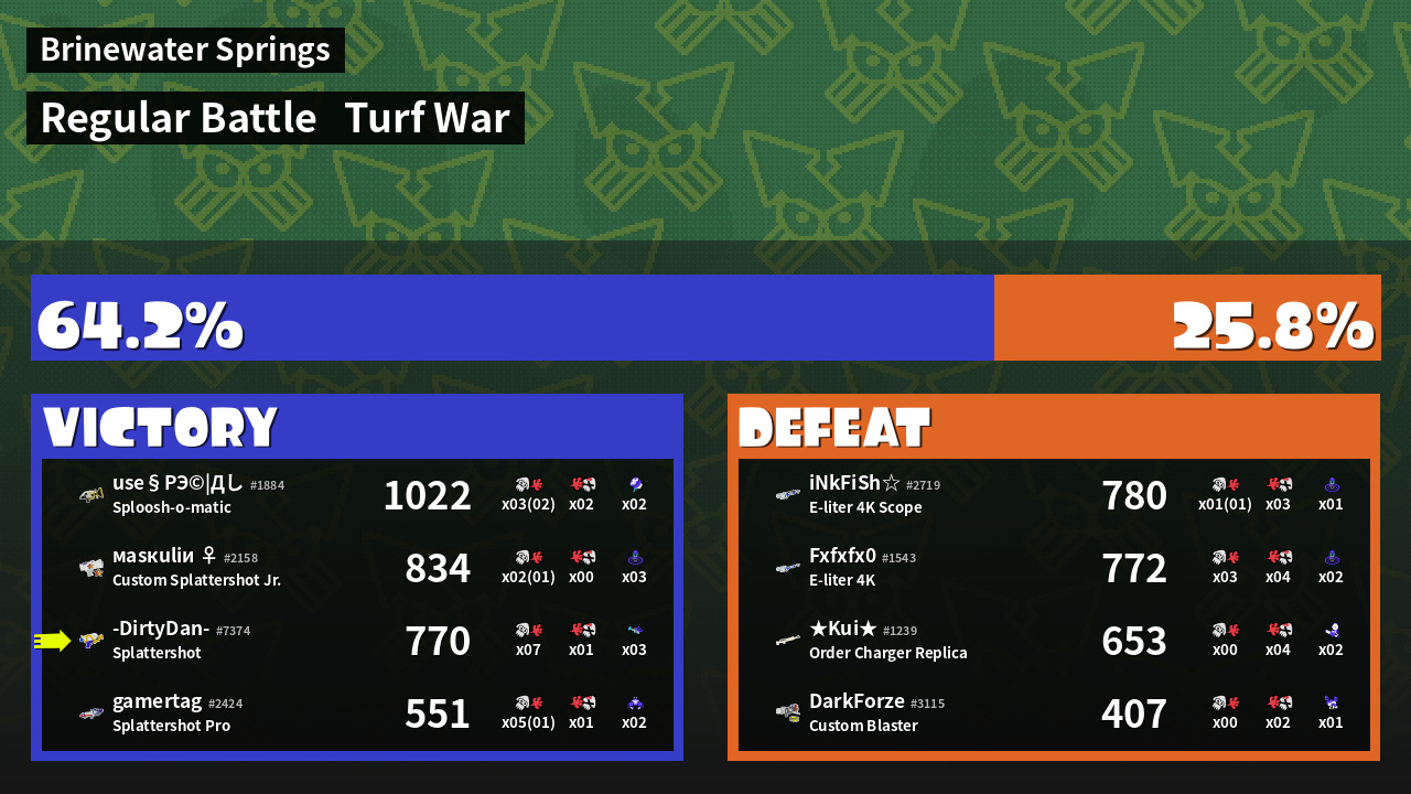 | Medals | #1 Overall Splatter #1 Home-Base Inker #1 Enemy Splatter | ||