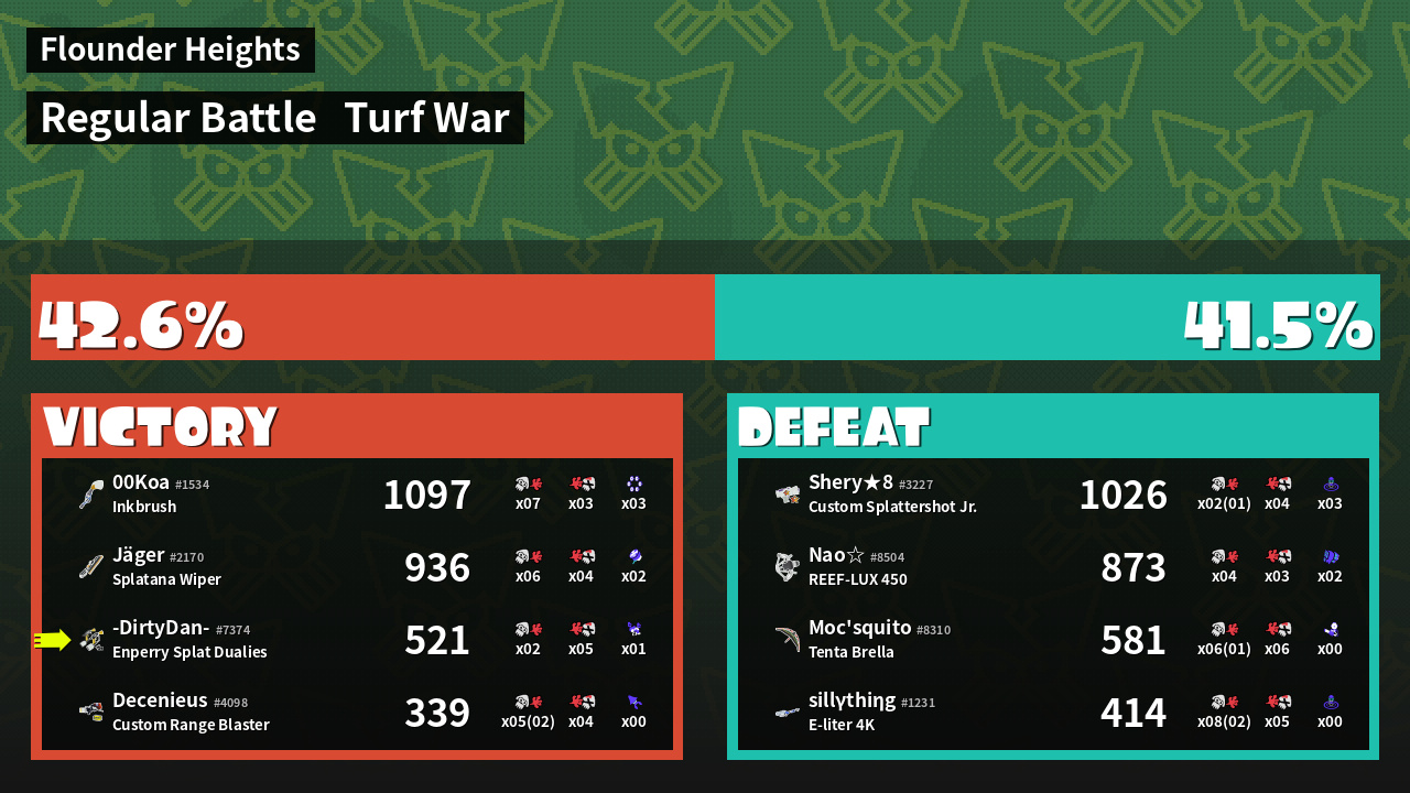 | Weapon | Enperry Splat Dualies ( Curling Bomb / Triple Splashdown) | ||
