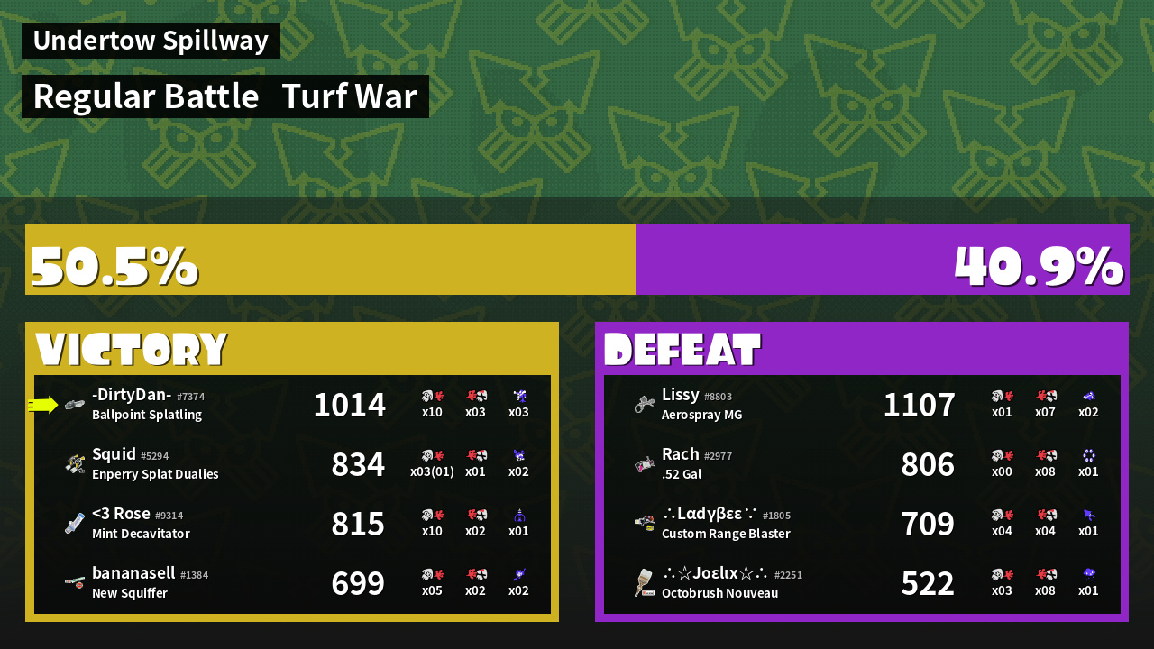 | Medals | #1 Overall Splatter #1 Turf Inker #1 Enemy Splatter | ||