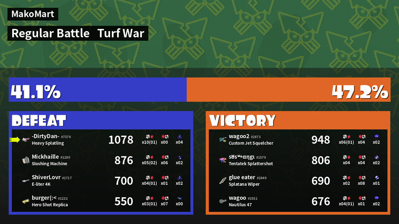 | Medals | #1 Overall Splatter #1 Turf Inker #1 Enemy Splatter | ||