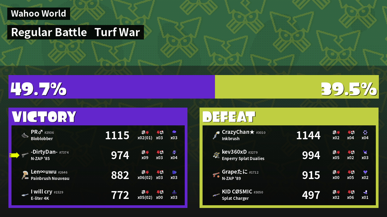 | Medals | #1 Overall Splatter #1 Enemy-Base Inker #1 Enemy Splatter | ||
