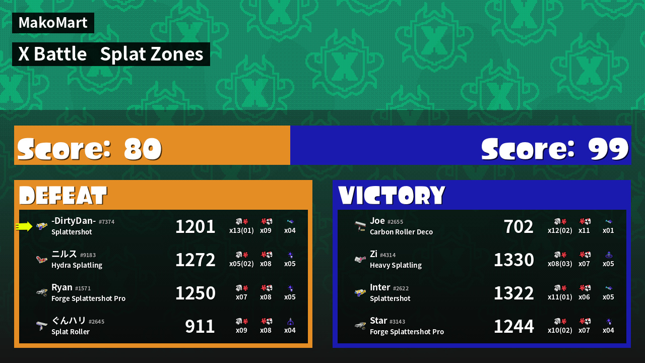 | Medals | #1 Overall Splatter #1 Splat Zone Guard #1 Popular Target | ||