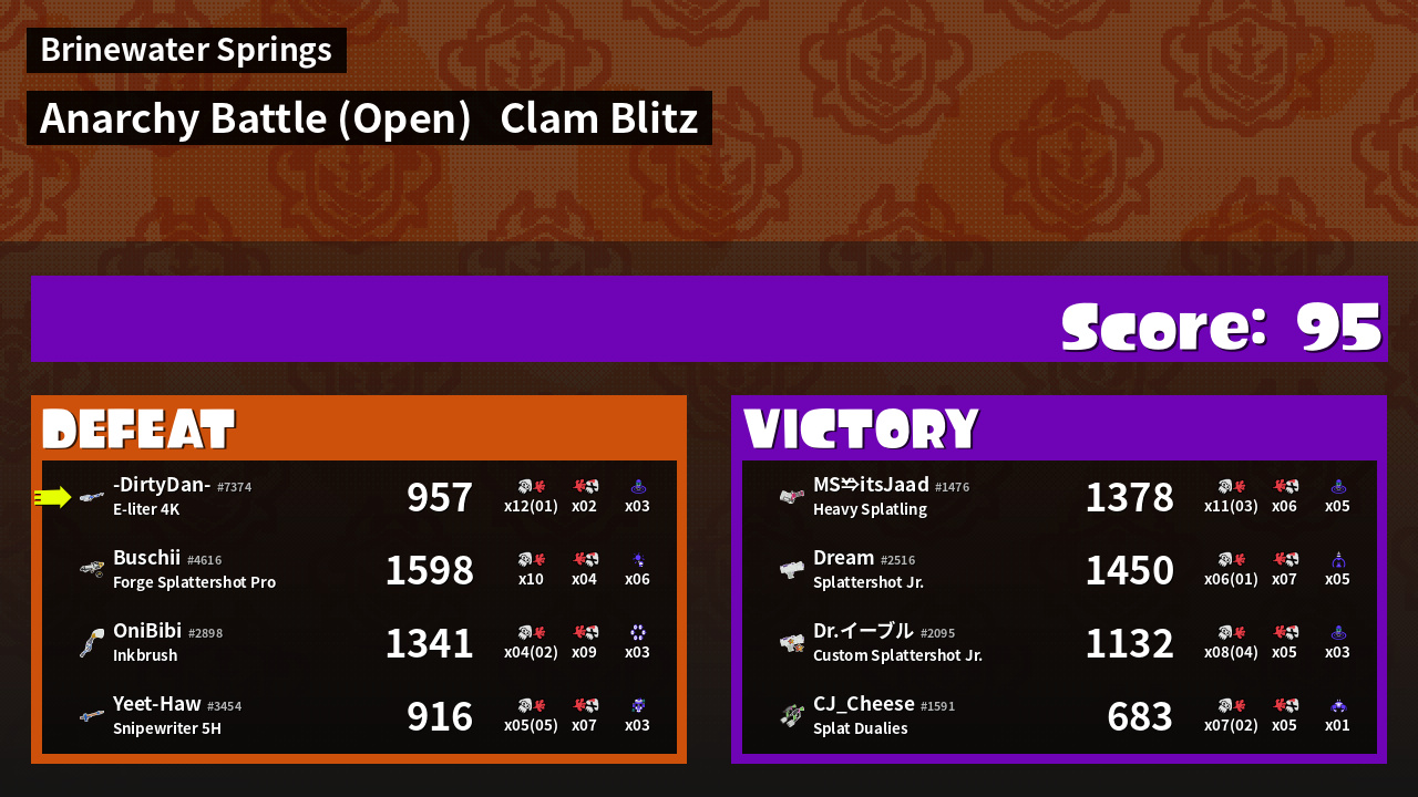 | Medals | #1 Overall Splatter #1 Enemy Splatter #1 Clam Stopper | ||