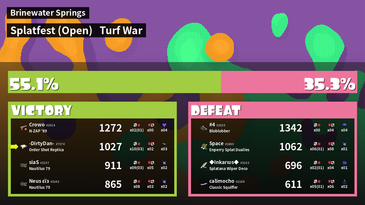 | Medals | #1 Overall Splatter #1 Enemy-Base Inker #1 Splat Assister | ||