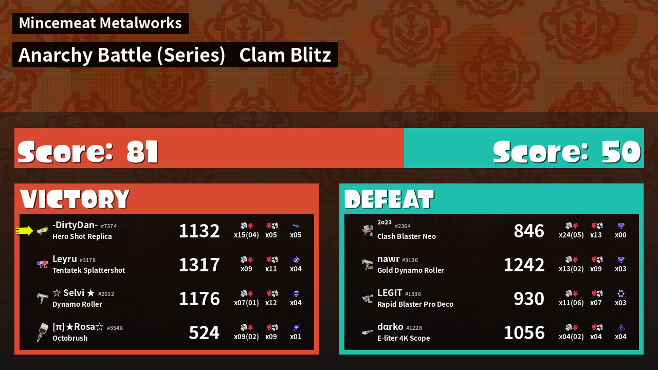 | Medals | #1 Overall Splatter #1 Clam Carrier #1 Popular Target | ||